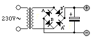 Achter de gelijkrichter hebben we een pulserende gelijkspanning, daarom wordt een elco geplaatst (met grote capaciteit) om de rimpelspanning te verminderen. De onbelaste spanning achter de elco is 1,414 × de wisselspanning die op de ingang van de gelijkrichter staat, minus de drempelspanning over twee diodes (1,4 volt). Dus bij een ingangsspanning van 12 volt wisselspanning staat er op de elco een spanning van: (12 × 1,414) - 1,4 = 15,56 volt.