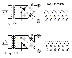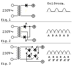 - de dubbelfazige/dubbelzijdige met een bruggelijkrichter (zie fig. 3). Frequentie op de uitgang = 100 herz.