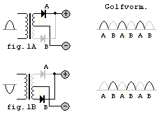 - de enkelfazige/enkelzijdige met één diode (zie fig. 1). Frequentie op de uitgang = 50 herz.