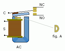 Bij een wisselspanningrelais (zie tekening 6) gebeurt precies hetzelfde. Alleen wisselt hier de polariteit van de spanning 50× per seconde (50 herz.). Daardoor trilt het weekijzeren anker 100 keer per seconde, aangezien het zowel op het positieve, als het negatieve deel van de sinus wordt aangetrokken. Bij de polariteitwisseling ontstaat ook even een nuldoorgang van de stroom. Op dat moment is de magnetische aantrekkingskracht even weg en zou het anker meteen weer afvallen. Om dat te voorkomen is een koperen plaatje in de vorm van een gesloten winding (zie fig. A op tekening 3) op de kern aangebracht. Wanneer het magnetisch veld het grootst is, gaat er in dat koper een kortsluitstroom lopen. Die stroom wekt weer een klein magnetisch veld op, dat zijn eigen ontstaan tegenwerkt. Gevolg hiervan is, dat er een beetje stroom loopt door het koperen plaatje bovenaan de kern als de stroom van de spoel door nul gaat. De aantrekkingskracht van de grote spoel is even nul, maar op dat moment is er wel een aantrekkingskracht welke veroorzaakt wordt door de stroom door het koperen plaatje. Hierdoor valt het anker niet af en ontstaat er geen trilling van het anker. Bij een wisselspanningrelais is de kern vaak opgebouwd uit stripjes weekijzer. Dit wordt gedaan om wervelstromen in de kern te voorkomen.
